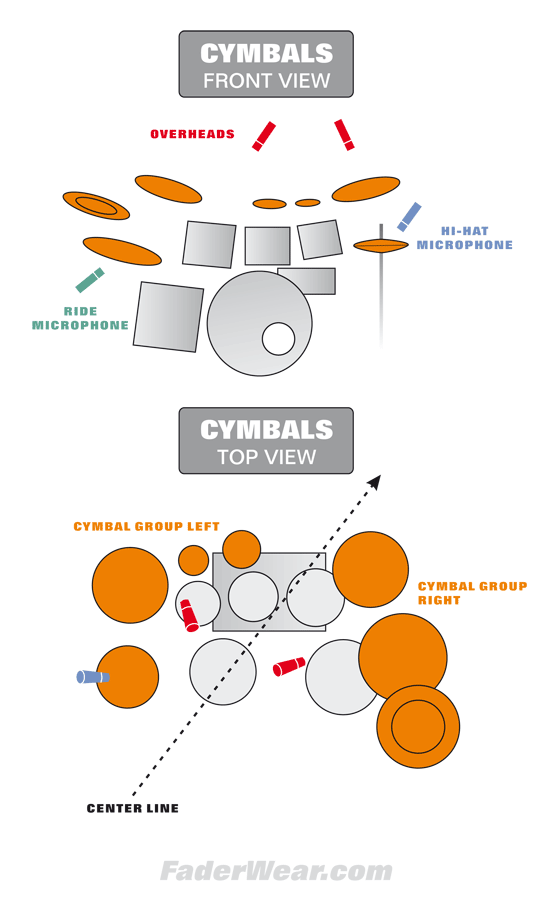 Some engineers like to record all cymbals separately to achieve maximum separation. Miking the cymbals in pairs is usually enough. Just remember to draw a picture of the microphone setup! If will be very hard to figure it out later without any visual information.